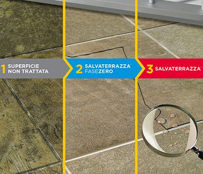 Preparazione di superfici prima dell’applicazione di SALVATERRAZZA® : bagnare preventivamente la superficie con acqua. Diluire 1:5, stendere e lasciare agire 2-3 minuti.Intervenire con spazzolone, monospazzola o spugna abrasiva.Raccogliere la soluzione con aspiraliquidi o straccio e risciacquare accuratamente con acqua.Per una pulizia più energica diluire 1:3.Su superficie asciutta e pulita, procedere con l’applicazione di SALVATERRAZZA® o di altri trattamenti idro oleo repellenti non filmanti.Per rimuovere l’eccesso di SALVATERRAZZA® o di altri trattamenti idro oleo repellenti non filmanti in caso di errata applicazione: stendere con pennello o spruzzare il prodotto non diluito direttamente sulla superficie.Dopo circa 15 minuti, strofinare con spazzolone o monospazzola e risciacquare accuratamente con acqua.