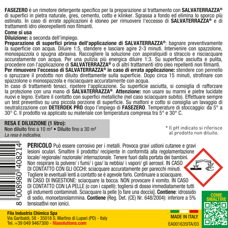 Non usare su marmi e pietre lucidate nuovi e legno. Evitare il contatto con superfici metalliche (nel caso sciacquare subito). Effettuare sempre un test preventivo su una piccola porzione di superficie. Su mattoni e cotto si consiglia un lavaggio di neutralizzazione con DETERDEK PRO dopo l’impiego di FASEZERO.