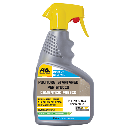 Una volta stuccato, attendere che l'impasto si addensi e diventi opaco (in genere dai 10 ai 30 minuti) in accordo con i tempi forniti dal produttore. Procedere ad una prima pulizia della superficie con spugna inumidita.Procedere con la pulizia finale ovvero l'operazione di finitura a fresco.Spruzzare INSTANT REMOVER in modo omogeneo sulla superficie.Lasciare agire 1-2 minuti a seconda della finitura del materiale.Intervenire con un frattazzo in spugna umida, avendo cura di risciacquarlo frequentemente per mantenerlo pulito.In caso di residui tenaci ripassare dopo 1 ora dalla stuccatura seguendo le istruzioni appena descritte.Per la messa in esercizio, riferirsi alle istruzioni del produttore dello stucco.