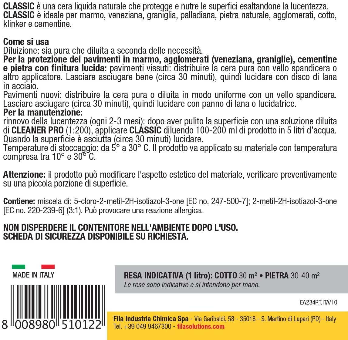 Distribuire la cera pura con vello spandicera o altro applicatore. Lasciare asciugare bene (circa 30 minuti), quindi lucidare con disco di lana in acciaio.Pavimenti nuovi:distribuire la cera pura o diluita in modo uniforme con un vello spandicera. Lasciare asciugare (circa 30 minuti), quindi lucidare con panno di lana o lucidatrice.Per la manutenzione:Rinnovo della lucentezza (ogni 2-3 mesi):dopo aver pulito la superficie con una soluzione diluita di CLEANER PRO (1:200), applicare CLASSIC diluendo 100-200 ml di prodotto in 5 litri d’acqua. Quando la superficie è asciutta (circa 30 minuti) lucidare.