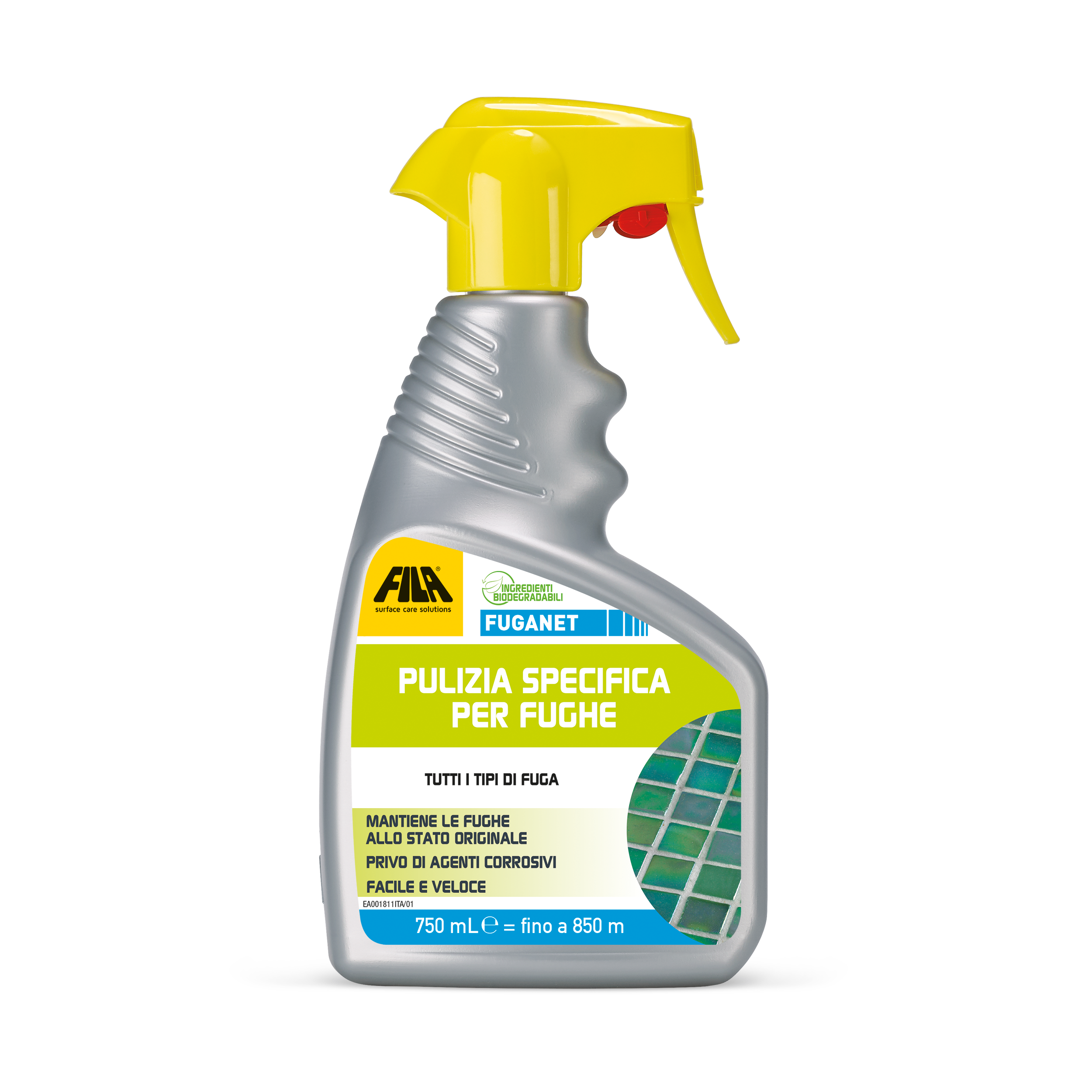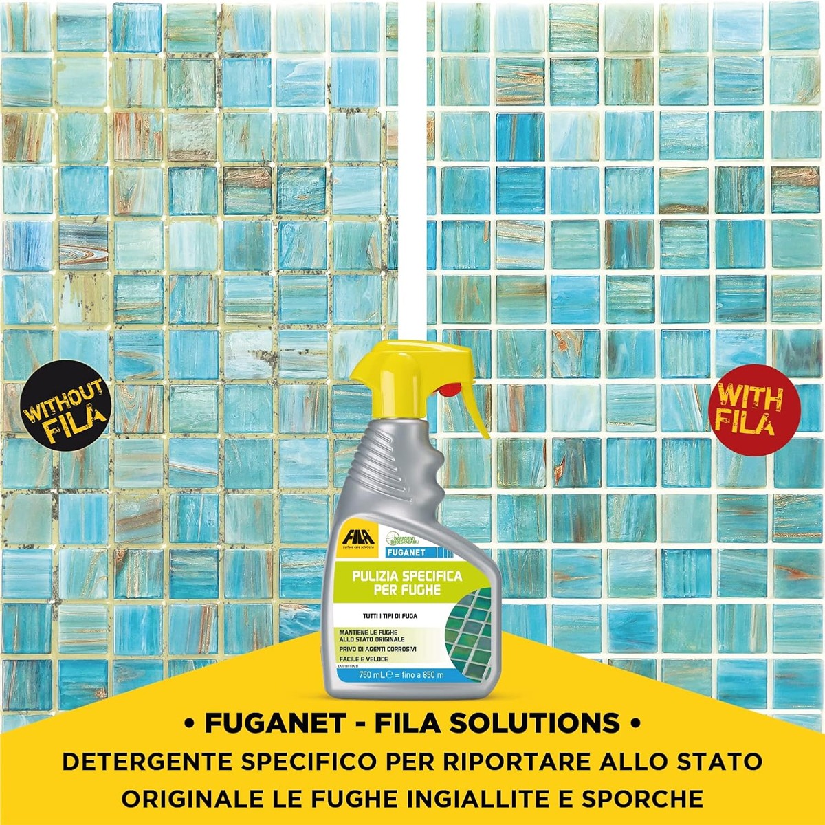 Spruzzare FUGANET direttamente sulla fuga. Lasciare agire qualche minuto e pulire strofinando con una spugna abrasiva o spazzolone. Nel caso di fughe molto sporche si consiglia di effettuare una prima pulizia più profonda utilizzando PULIZIA DISINCROSTANTE o DETERDEK PRO, diluito 1:10.