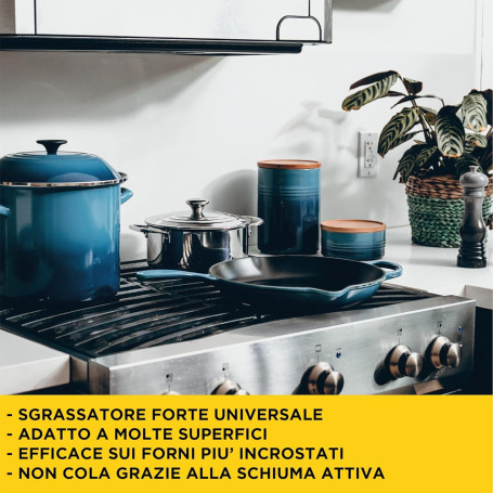 Su superfici con sporco normale o intenso (piani cottura, griglie, tapparelle, cerchioni auto, mobili da giardino, bici, etc..):