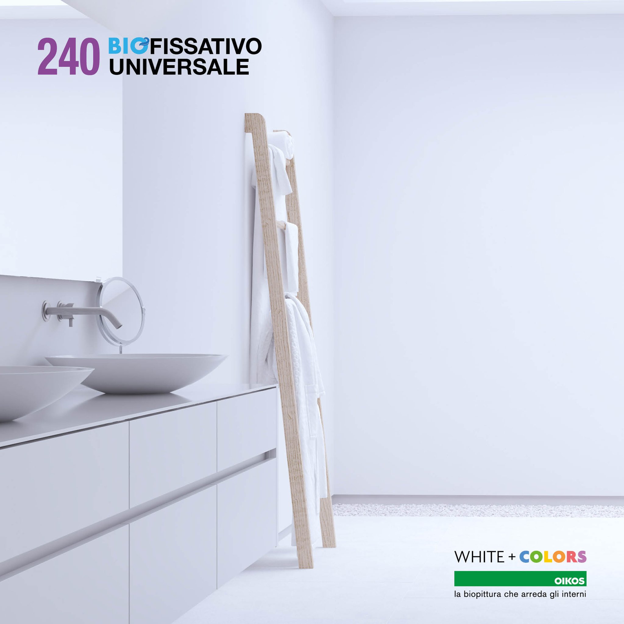 240 BIOFISSATIVO UNIVERSALE è uno speciale fissativo ancorante acrilico per interni. Garantisce una resa elevata e ottima adesione, consolida superfici soggette a sfarinamento, rasature a gesso e superfici murali nuove, favorendo l’applicazione della finitura.