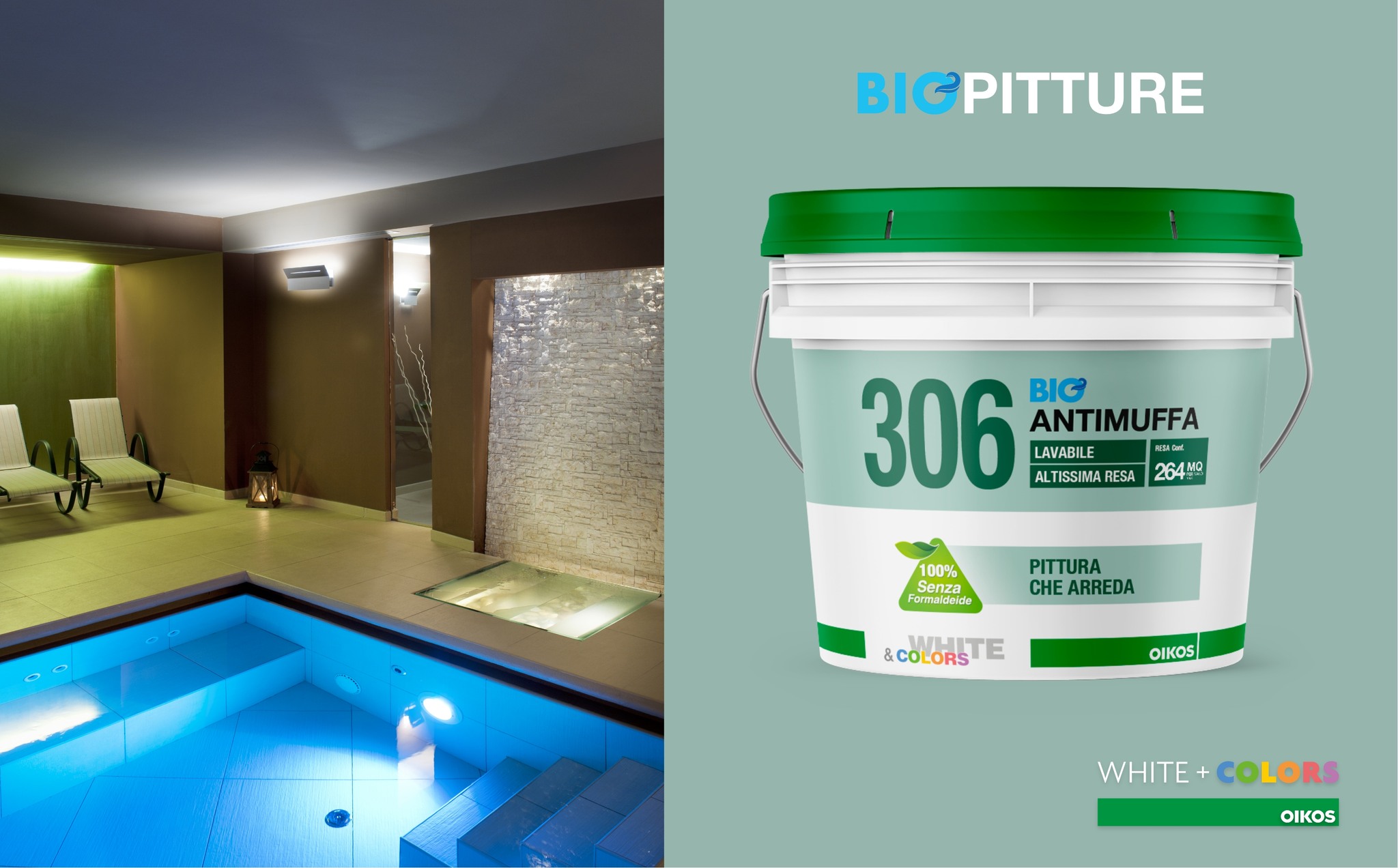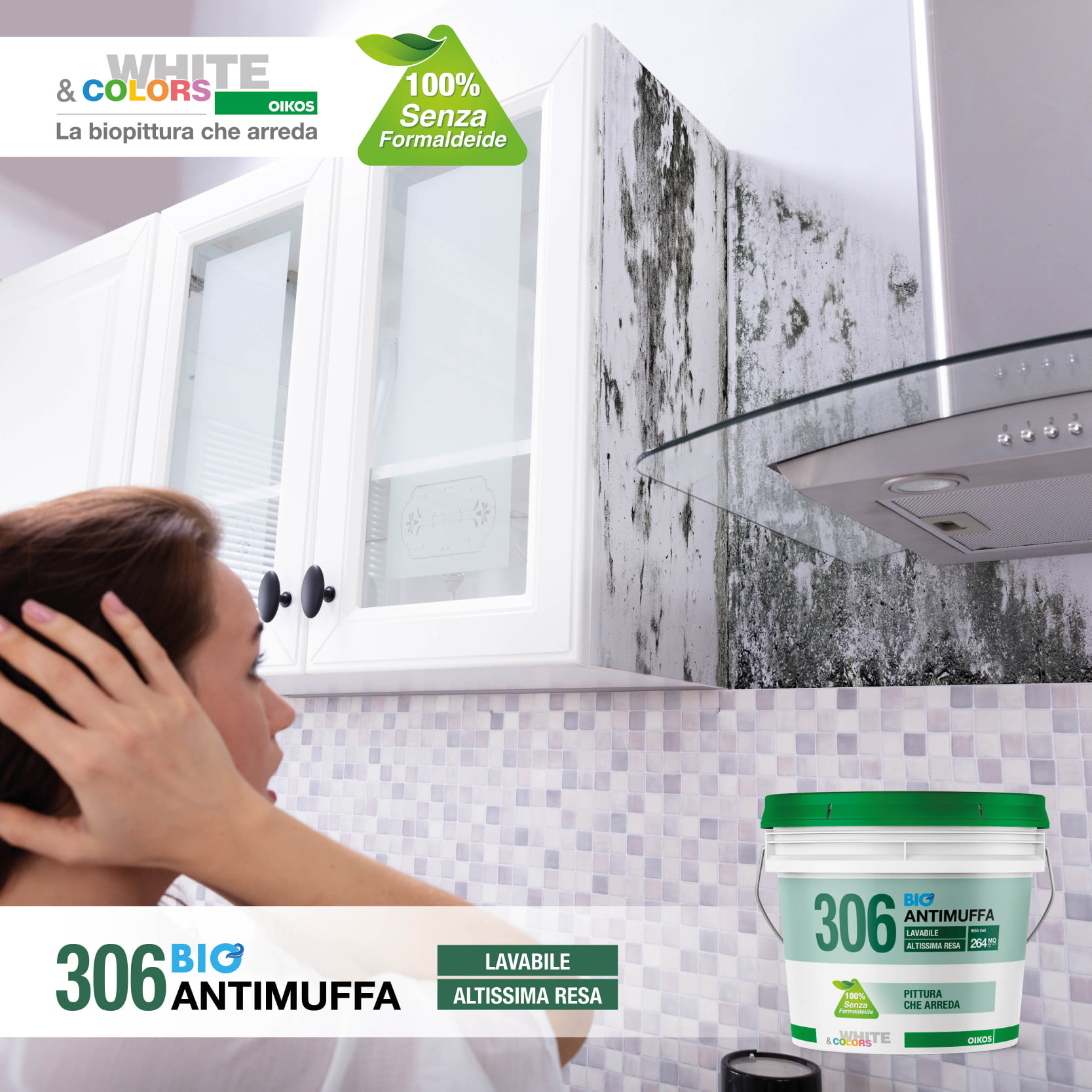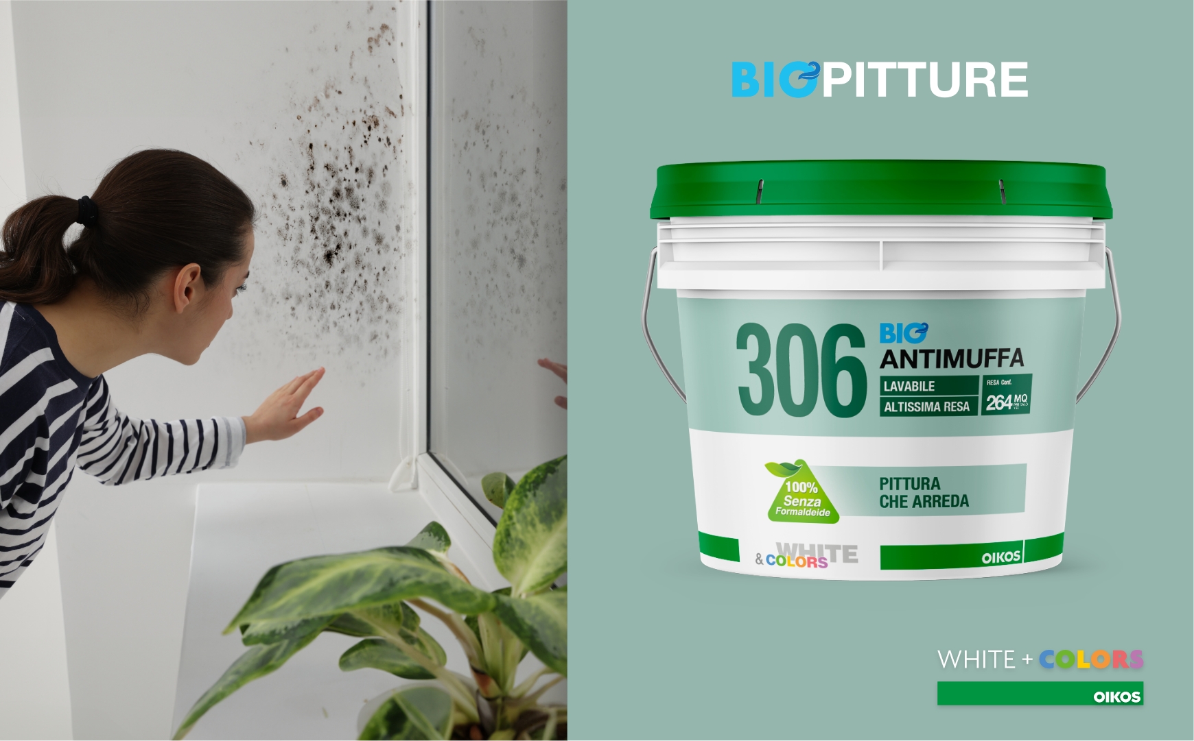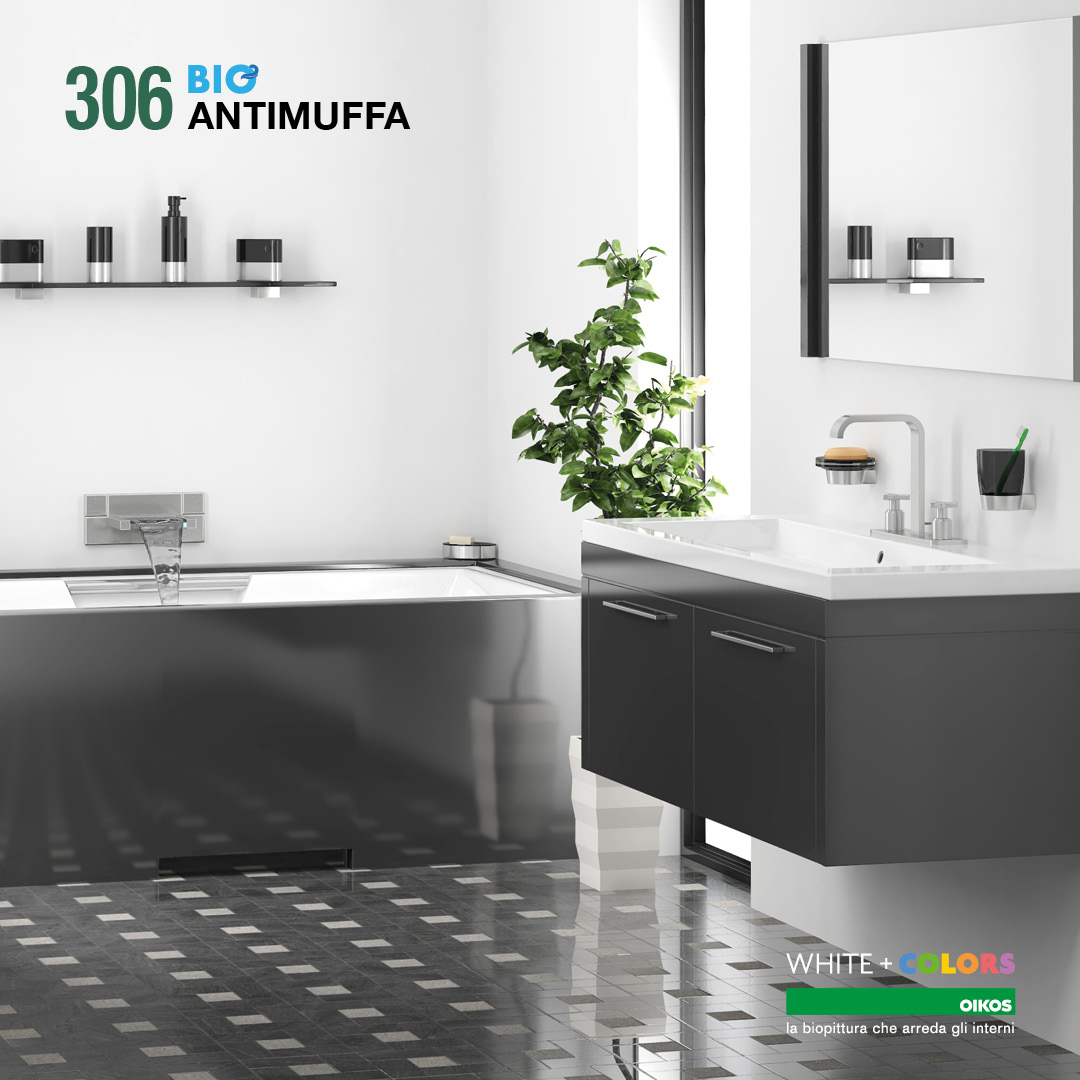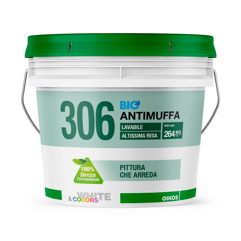 306 BioAntimuffa è una biopittura per interni sanitizzante con buona lavabilità, capace di contrastare la formazione di muffa sulle pareti. 306 BioAntimuffa è efficace in caso di pareti già interessate da muffe e alghe, anche in maniera estesa, dove può essere impiegato per ripristinare la salubrità delle superfici e prevenire nuovi attacchi. Protegge le pareti dall’attacco di muffe e alghe, prevenendone lo sviluppo e la formazione, grazie agli speciali battericidi e fungicidi ad ampio spettro. 306 BioAntimuffa è ideale soprattutto in ambienti con scarsa areazione come cucine, bagni, cantine e in generale per pareti esposte a Nord, dove la presenza di vapore acqueo, di umidità e di sbalzi termici tendono a favorirne lo sviluppo e la formazione di muffe. Indicato in generale per tutti gli ambienti della casa, compresi soggiorno, camere da letto e luoghi di passaggio. 306 BioAntimuffa aumenta la sua azione protettiva e preventiva contro la muffa, se applicato insieme allo specifico ciclo di pulizia della linea pitture sanitizzanti Oikos. Prodotto senza formaldeide e certificato in classe di emissione “A+” (Decreto della Gazzetta Ufficiale Francese del 19 aprile 2011).