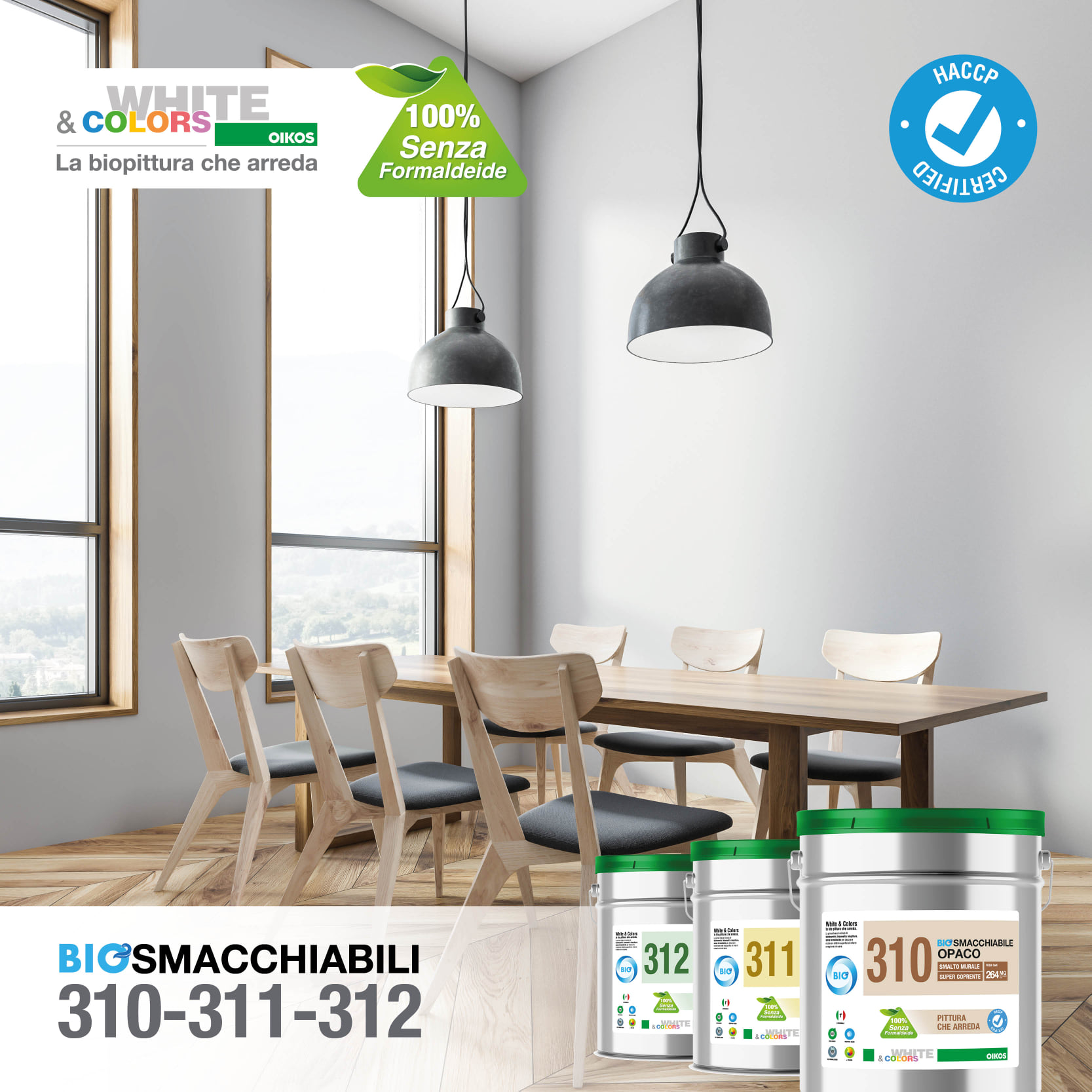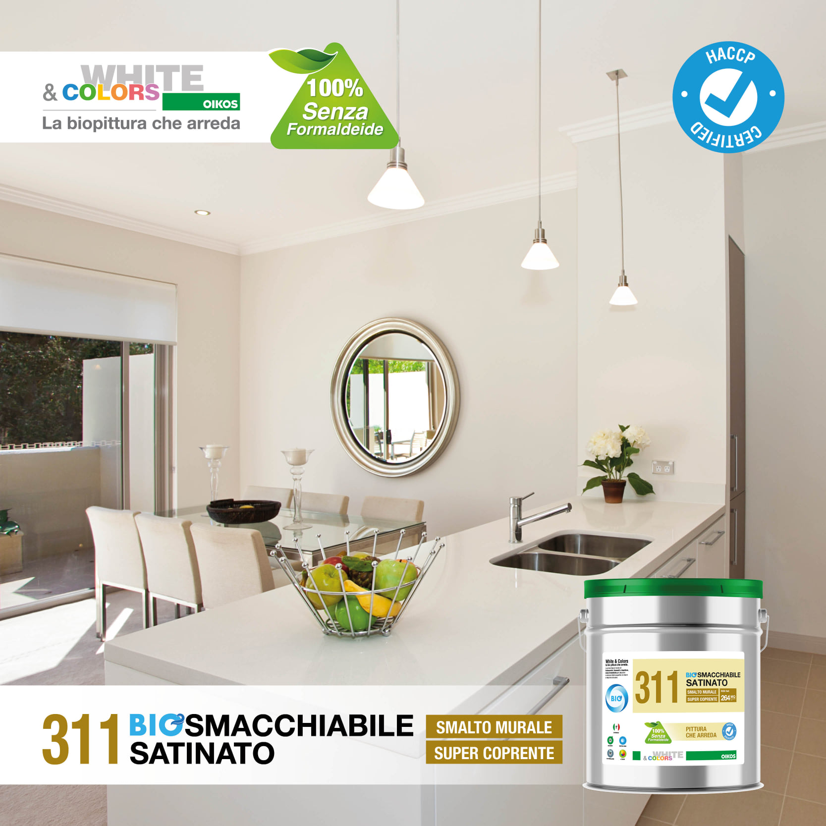 311 Bio Smacchiabile satinato è una pittura certificata sottoposta a tutte le prove indicate dalla norma UNI 11021:2002 “Prodotti e sistemi per la verniciatura di ambienti con presenza di alimenti”; adatta quindi agli ambienti nei quali è indispensabile pulizia e disinfezione, come ambienti pubblici, ospedali, ambulatori, scuole, ma anche ristoranti, alberghi oppure ambienti della casa di frequente traffico, come corridoi, scale, ingressi e cucine, più soggetti di altri a sporco e usura.