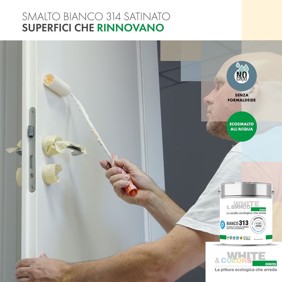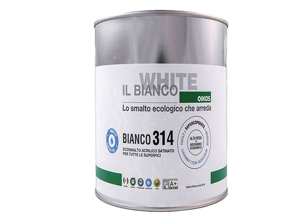 314 Biosmalto satinato è uno smalto ecologico: la sua speciale formulazione, senza formaldeide e senza solventi, non richiede negli interni particolare areazione.