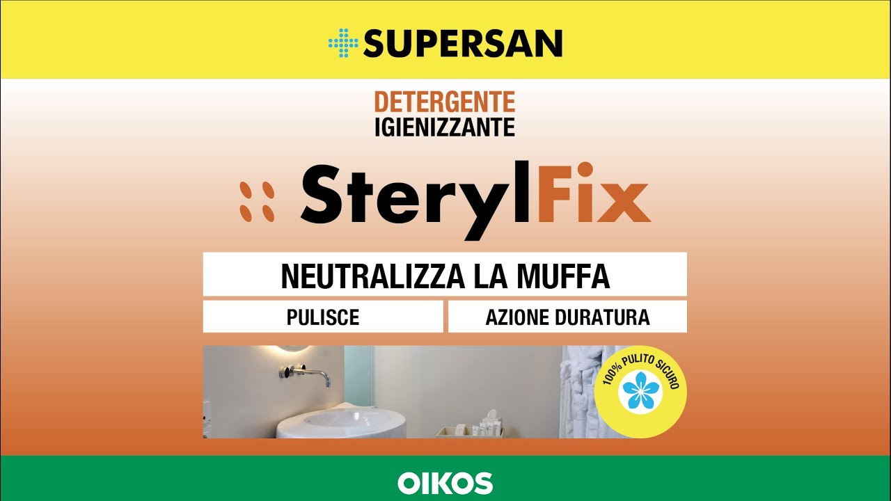 SterylFix è uno speciale detergente igienizzante incolore che nasce per facilitare la rimozione di muffe ed alghe dalle pareti contaminate attivando un’azione neutralizzante e duratura nel tempo. Grazie alla sua formulazione è in grado di eliminare ogni traccia di muffa presente nei punti più umidi delle pareti.