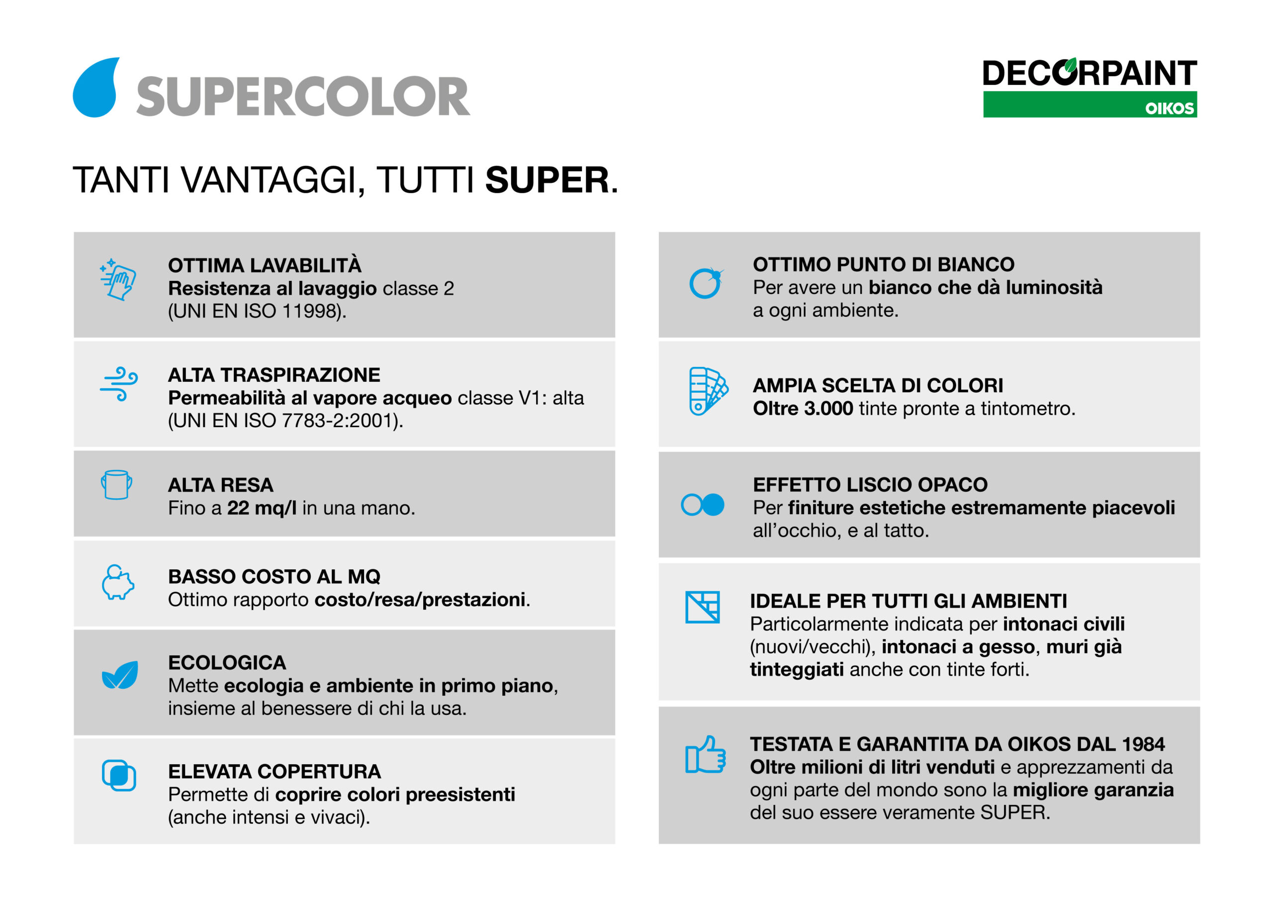 Supercolor è la pittura ecologica che garantisce massime prestazioni in lavabilità, traspirabilità, resa e copertura.
