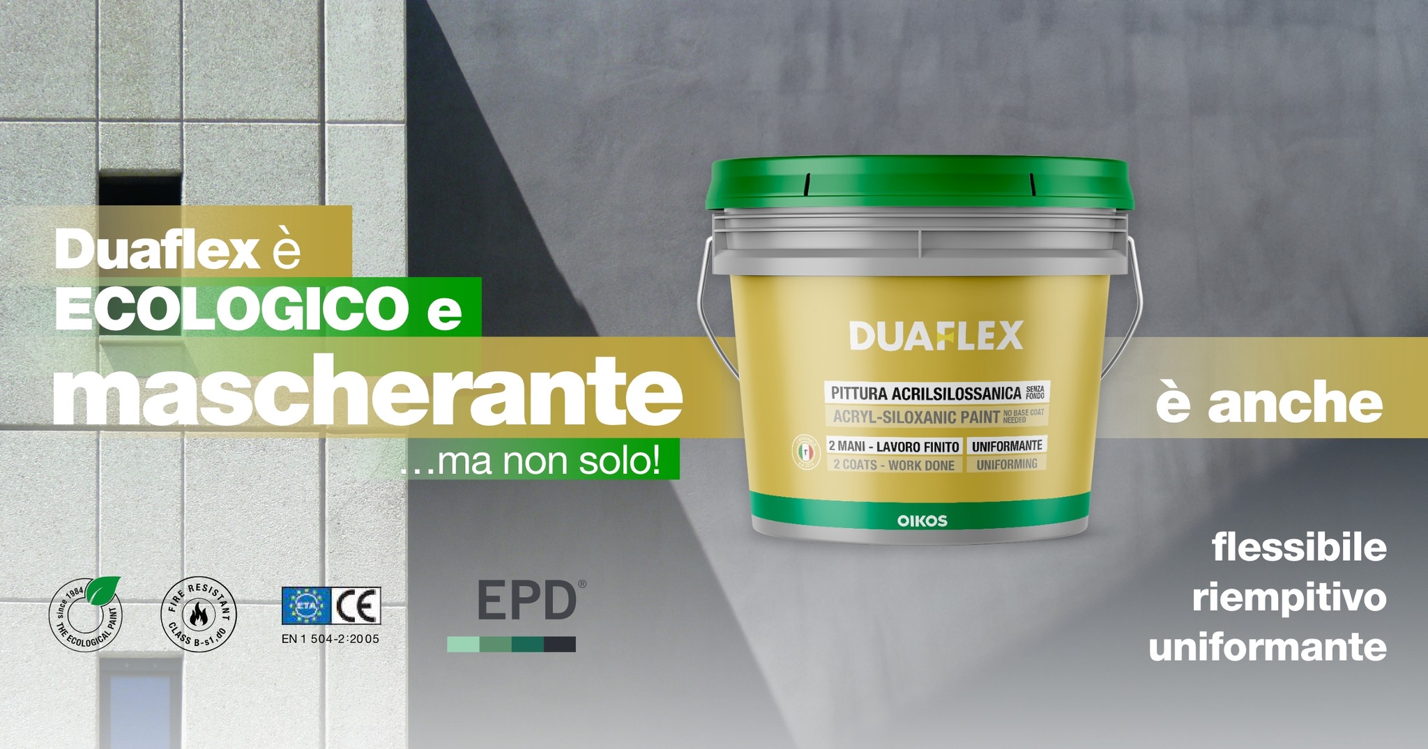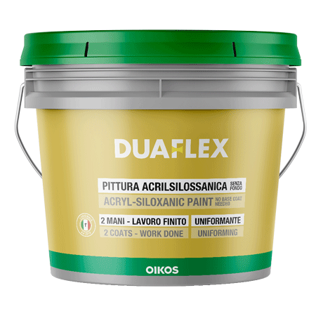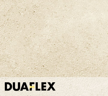 Duaflex è una pittura ecologica di finitura uniformante, riempitiva, flessibile ad effetto ruvido opaco, per superfici esterne ed interne. Le cariche a granulometria controllata (0,3 o 0,7 mm) conferiscono al prodotto ottimo potere riempitivo ed omogeneizzante andando ad uniformare piccole imperfezioni ed irregolarità dei supporti. Duaflex è composto da resine acrilsilossaniche ed elastomeriche in dispersione acquosa, che rendono il prodotto flessibile e con ottima adesione anche su superfici difficili (ceramica, pietra, cemento liscio).
