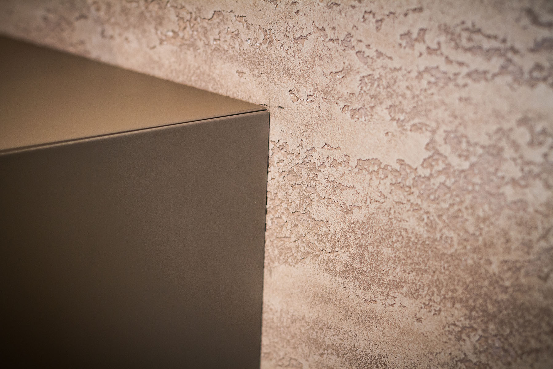 Effetto Metropolitano: Procedere con l’applicazione di TRAVERTINO ROMANO come per la lavorazione precedente realizzando le venature in senso diagonale. Dopo l’essiccazione applicare OTTOCENTO sfumando il prodotto non diluito con una spugna sintetica solo sulle parti piane lisce ed evitando di colorare le venature.