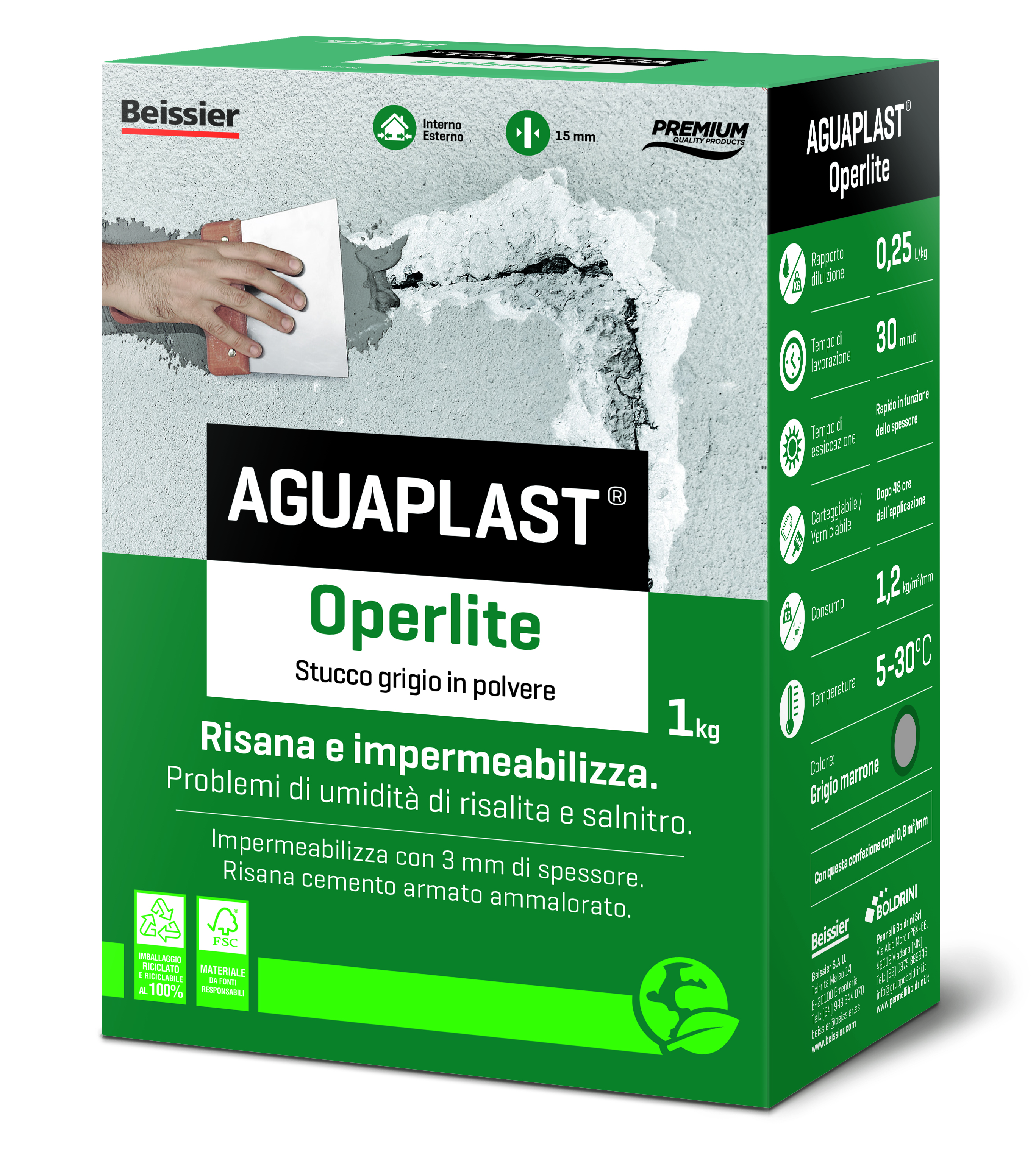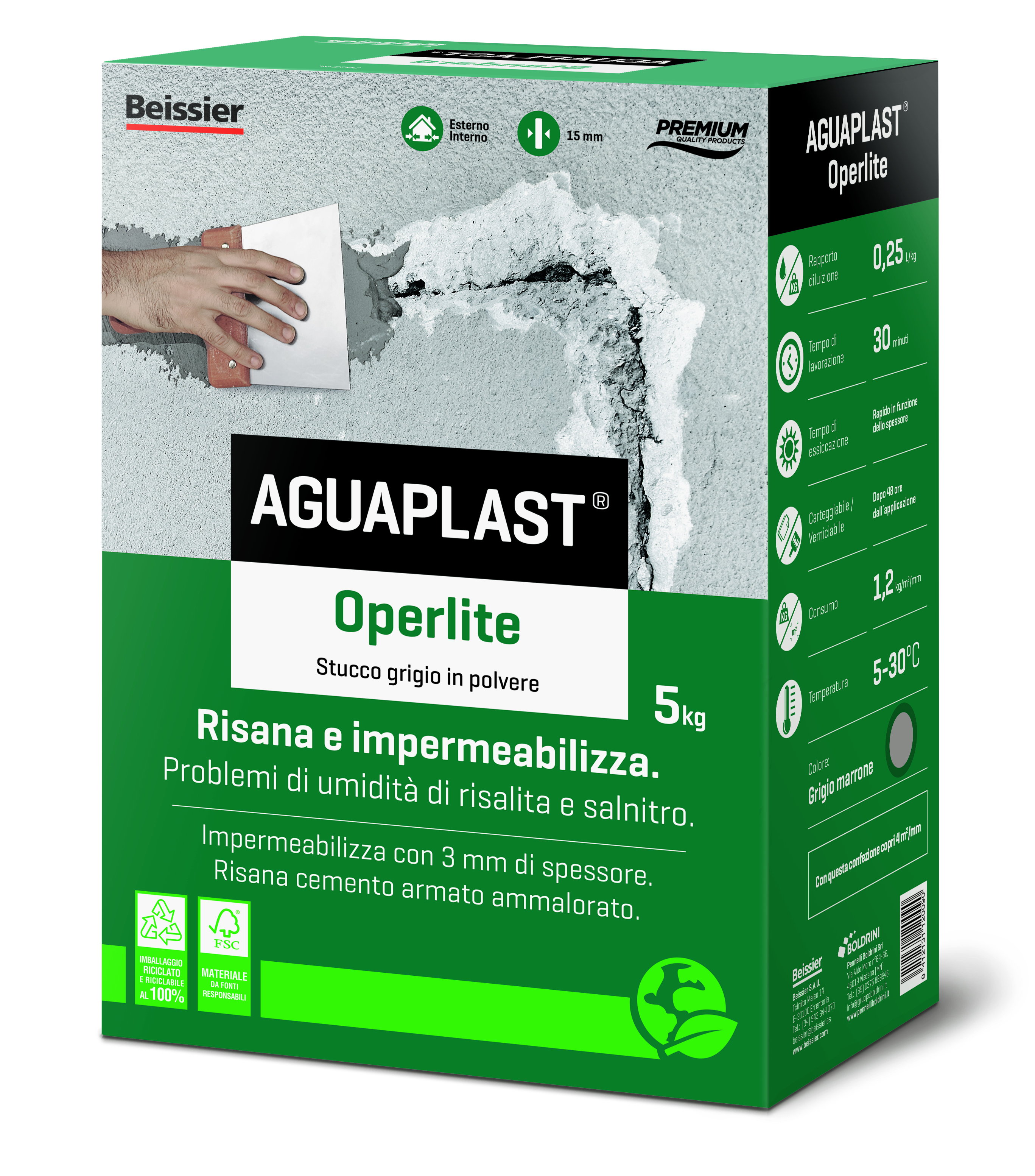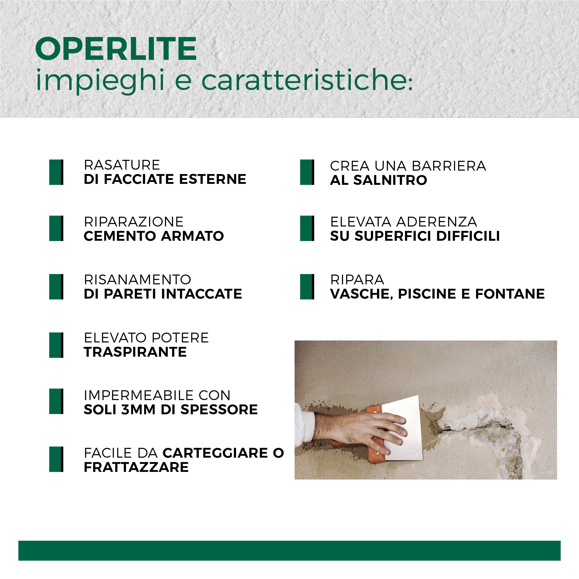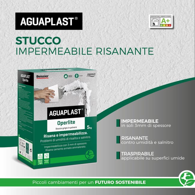 Aguaplast Operlite è uno stucco impermeabile e traspirante, ideale per il risanamento di pareti intaccate da umidità di risalita e salnitro. La sua formulazione consente l’applicazione diretta su superfici umide, anche in presenza di acqua costante, creando una barriera protettiva con soli 3 mm di spessore.