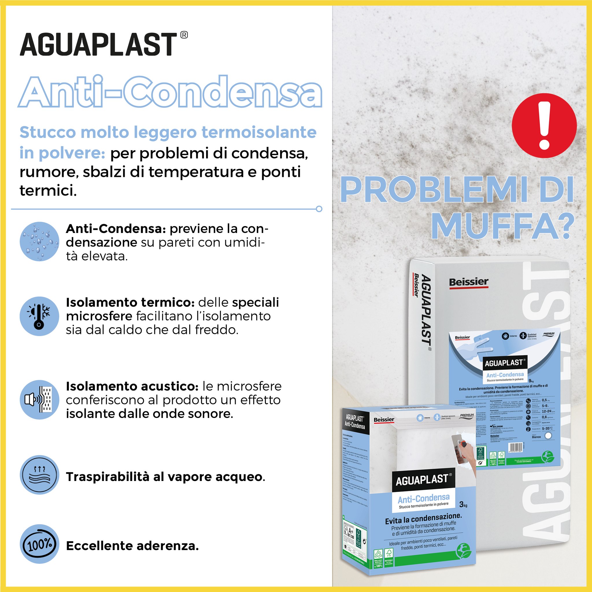 Aguaplast Anti Condensa è uno stucco in polvere ad alte prestazioni, progettato per migliorare l’isolamento termico e ridurre la formazione di condensa negli ambienti interni. Grazie alla sua formulazione specifica, è particolarmente indicato per pareti fredde, zone poco ventilate e superfici soggette a sbalzi termici. Il prodotto agisce come barriera contro l’umidità, contribuendo a prevenire la comparsa di muffe e il deterioramento del rivestimento originale.