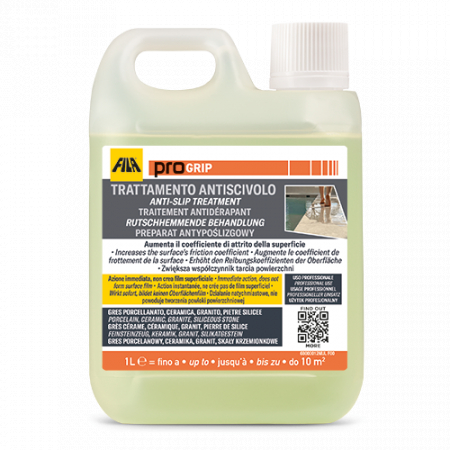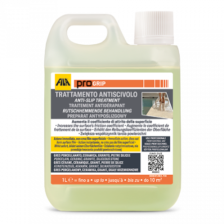 1. Determinazione del tempo di contattoData la diversità dei materiali è necessario determinare il tempo di contatto più adeguato, eseguendo una prova preventiva su una piastrella non posata o una zona limitata e nascosta.Proteggere i materiali adiacenti o zone che non sono soggette al trattamento.PROGRIP agisce già dopo un minuto. Solo dopo aver testato il tempo di 1 minuto, se ritenuto insufficiente, è possibile eseguire il test con tempi di contatto progressivamente superiori.2. Preparazione della superficiePreparare la superficie al trattamento con un lavaggio in base al tipo di sporco presente sulla superficie (es. DETERDEK PRO nel caso di incrostazioni calcaree o cementizie, oppure PS87 PRO nel caso di sporco organico o patine causate da manutenzione erronea).Per facilitare le fasi di applicazione suddividere, la superficie da trattare in piccole zone da 1 a 3 mq avendo cura di perimetrare la zona in corrispondenza dei giunti.3. ApplicazioneSu superficie asciutta e pulita, stendere PROGRIP con un vello o pad bianco e lasciare agire per il tempo di contatto determinato, mantenendo sempre bagnata la superficie.Quindi aspirare con aspiraliquidi o rimuovere il residuo con straccio o mop.Sciacquare accuratamente con acqua e procedere all'intervento nella zona successiva.Per ottenere un risultato complessivamente uniforme è importante mantenere sempre lo stesso tempo di azione e lo stesso metodo applicativo su tutte le zone di intervento.Al termine è consigliato un lavaggio neutralizzante con CLEANER PRO (diluito 1:200 ovvero 25 mL in 5 litri d’acqua) e pad bianco sull’intera superficie trattata.