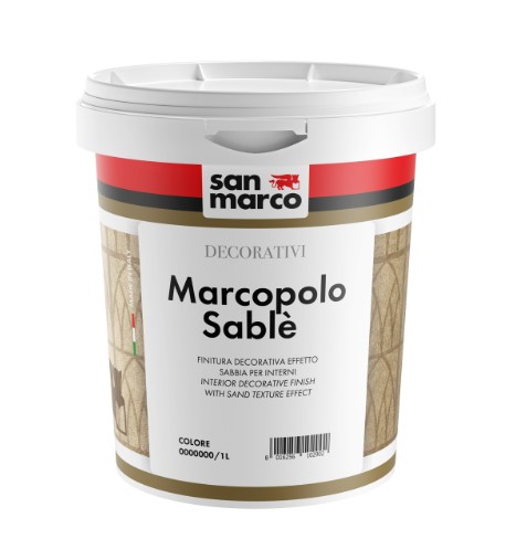 MARCOPOLO SABLÈ è una pittura decorativa effetto sabbia per interni, ideale per ottenere superfici opache, sfumate e piacevolmente ruvide al tatto. Perfetta per pareti e soffitti, valorizza ambienti classici e moderni grazie ai suoi caldi riflessi e alla texture materica.