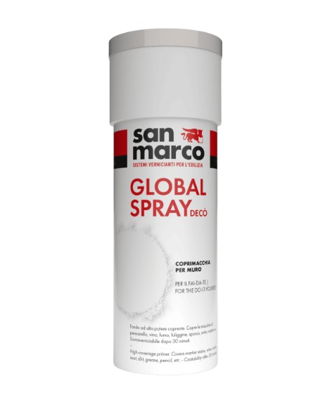 GLOBAL SPRAY COPRIMACCHIA è la soluzione professionale rapida per isolare e coprire definitivamente macchie difficili su muri, soffitti e superfici di varia natura. Grazie alla sua formula speciale, blocca ed evita la ricomparsa di macchie causate da fumo, fuliggine, umidità, grasso, inchiostro, matita e pennarelli.