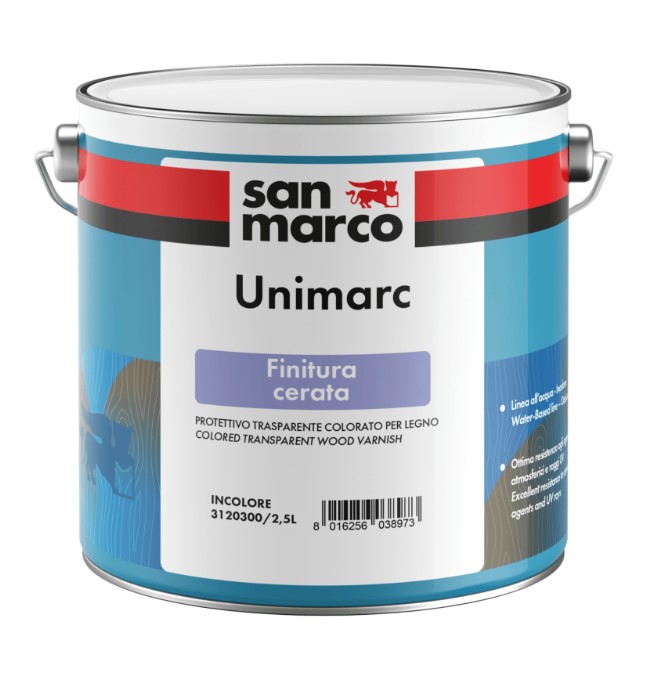 UNIMARC FINITURA CERATA un protettivo idrodiluibile di alta qualità, specifico per il trattamento del legno sia all'interno che all'esterno. Grazie alla sua formulazione a base di resine acriliche e speciali cere, decora il supporto conferendo un raffinato aspetto satinato e una sensazione setosa al tatto, lasciando visibili le naturali venature del legno.